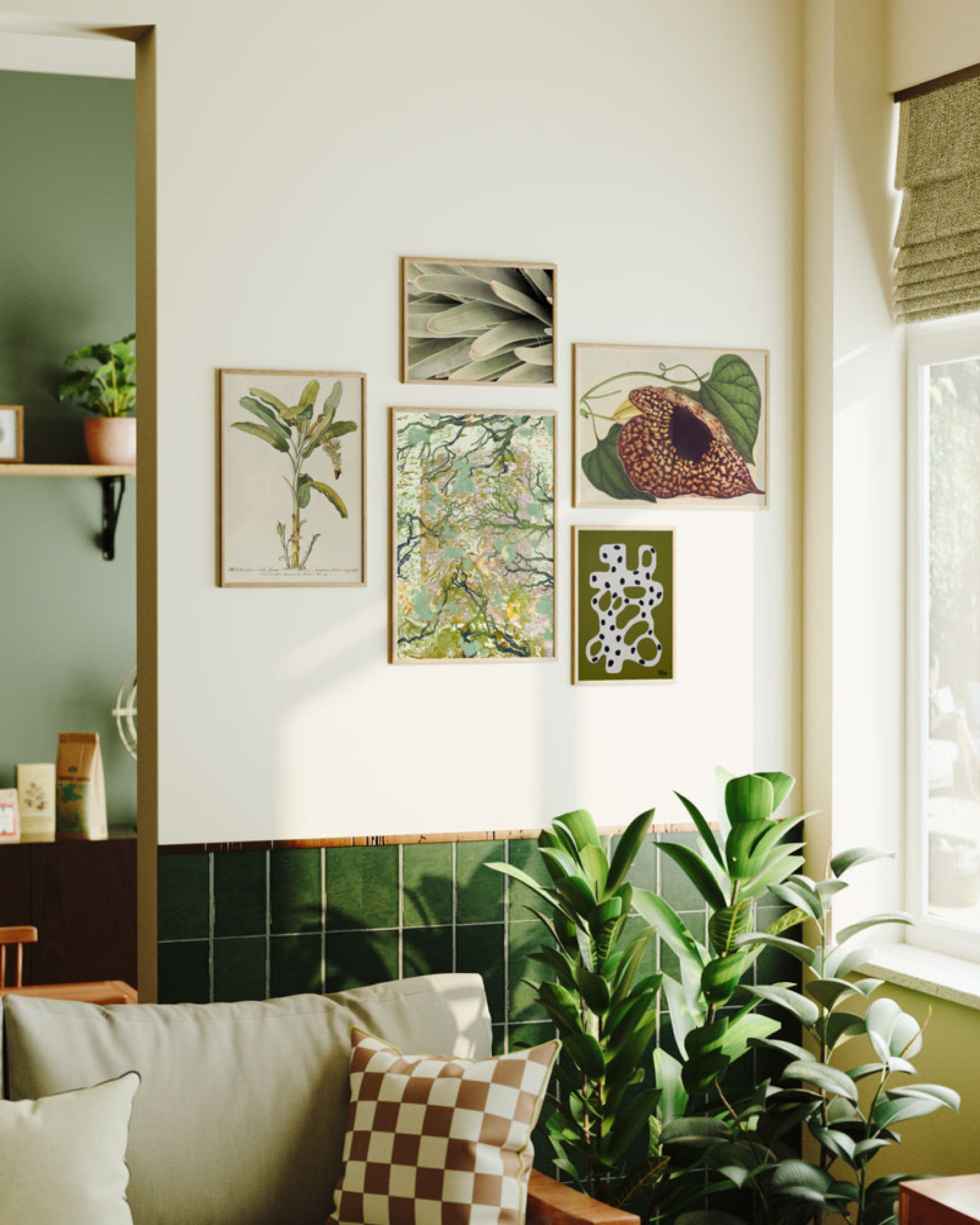This gallery wall creates a calm, garden-like feel. It features botanical art in green and earth tones, blending plant illustrations with abstract designs. It's a simple, beautiful way to bring nature's peace inside